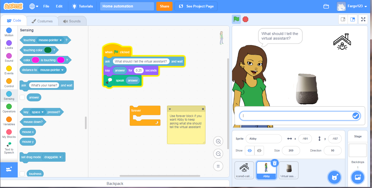 Image: Screen capture of Scratch 3 program, showing sprite (Abby) asking what she should tell the virtual assistant to add.